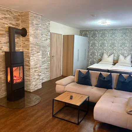 1-Zimmer-Apartment Mit Pool Und Kamin has an access to an equipped kitchenette with an oven and a dishwasher. Guests might as well go for a swim in a private pool.